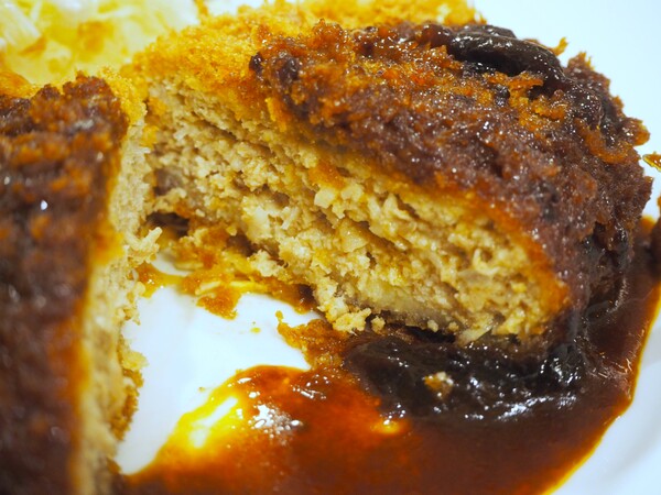 ナイフを入れると、中にはお肉がぎっしり。口に入れると脂がじゅわーっとあふれて、衣は期待どおりにサックサク。豚肉だけでなく牛スジも混ぜているそうで、なるほど、お肉にひと味違うコクと旨味があるのはその工夫のおかげなんですね! 揚げ油はラード100%で、カラッと油っこくなく揚がっています。