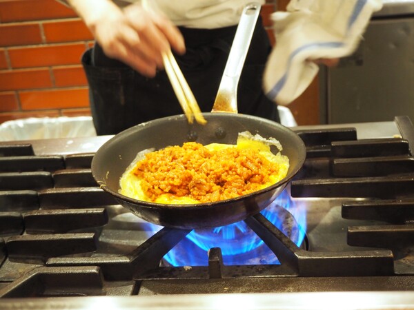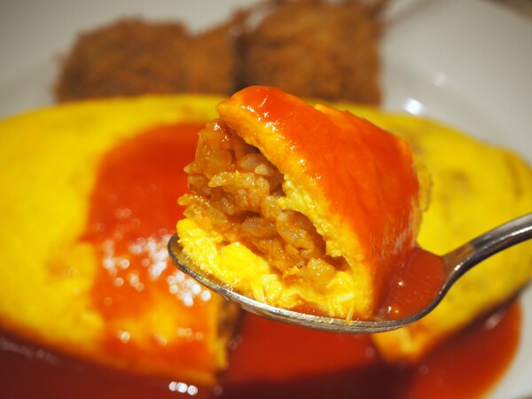 中のご飯は、醤油、白ワイン、日本酒にケチャップを加えた特製のタレをご飯と合わせ、酸味を飛ばしながら炒めたしっとり系です。ケチャップたっぷりですが、これもただのケチャップではありませんでした! オムライス用に特別に選んだ信州産のケチャップにブイヨンを合わせたソースにしているので、濃すぎることなく、トマトの甘味と爽やかな酸味が広がります。そして、卵も攪拌した後、漉し器で丁寧に漉してから使っているそうで、ふんわり、なめらかな口当たり。プロの技を感じた一皿でした。