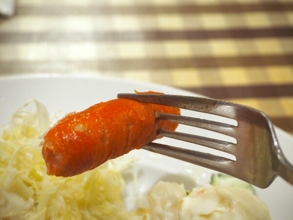 付け合わせは、定番のキャベツとハムが丸1枚、自家製ポテトサラダ、そして! 赤いウインナーです。このウインナー、地味にうれしい!(笑) 今ではあまり見なくなりましたが、懐かしいですね~。ポテトサラダも単品で提供しているものと同じなので、満足感いっぱいです。