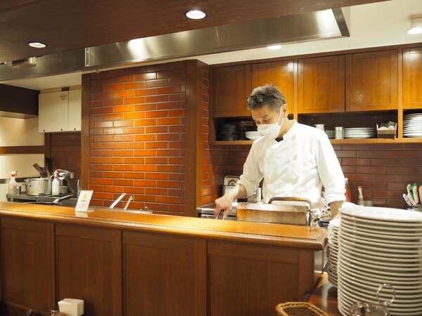 オープンキッチンに立つシェフは、もう10年以上ここで腕を振るっているそう。「せっかくお金を払って食べてくださるのだから、楽しんでいただけるお食事を」をモットーにしていて、メンチカツに牛スジを混ぜたり、オムライスのケチャップにひと味加えたり、サラダのドレッシングにも蜂蜜やレモン汁を加えたりと、手間ひまを惜しまず工夫を凝らしているそうです。