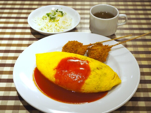 もう1品、外せないのが「昔ながらのオムライス(串カツ2本付)」1,500円。“昔ながら”というだけあって、半熟卵を上にのせたタイプではなく、ご飯をきれいに包んだオムライスです。家で作るとほとんどうまくできないやつです(笑)。しかも、串カツまで付いているなんて…、素晴らしい!