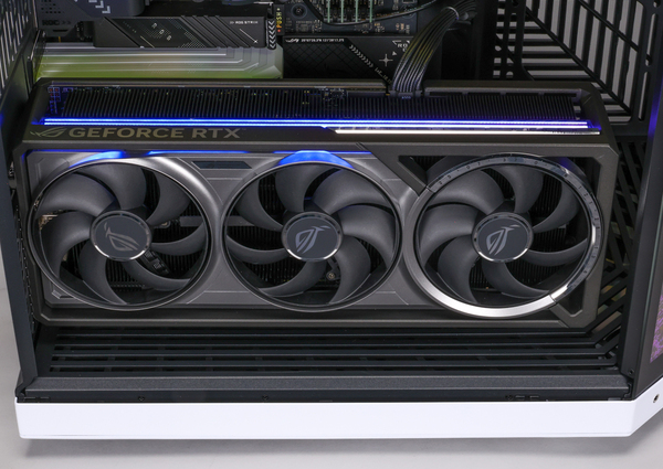 組み合わされるGPUはRTX 5090で、試用機ではクーラーと同じASUS製の「TUG Gaming GeForce RTX 5090 32GB GDDR7」が装着されていた。このカードは、GPUクーラーにブレードとバリアリングが一体化した「Axial Tech」仕様のファンを3基搭載し、両端の2基が反時計周り、中央の1基が時計回りと、回転の向きが異なっている点がユニーク。