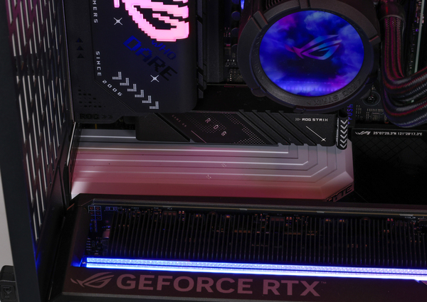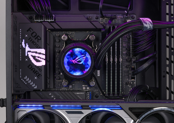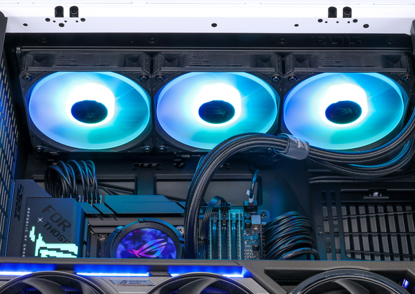 Ryzen 7 9800X3DのTDP(熱設計消費電力)は120Wもあるが、ZEFT R60RAではその冷却にASUS製の簡易水冷タイプ「ROG Strix LC III 360 ARGB」を装着。このクーラーは、ASUSによるとAsetek製の第7世代v2ポンプを採用し、冷却性能が100W向上しているという。