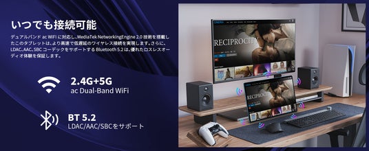 デュアルバンドac WiFiに対応し、MediaTek NetworkingEngine 2.0 技術を搭載したこのタブレットは、より高速で低遅延のワイヤレス接続を実現します。さらに、LDAC、AAC、SBCコーデックをサポートするBluetooth 5.2は、優れたロスレスオーディオ体験を保証します。