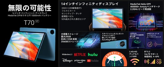 【14インチ+G99】Teclast最初14インチ大画面タブレット「T70」再入荷キャンペーン!高性能G99、10000mAh大容量+18W快充、1920×1200 IPS+Widevine L1対応
