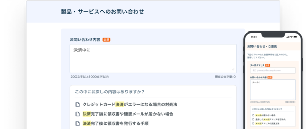 「問い合わせフォーム連携機能」は、問い合わせしようとしている顧客がフォームに入力した文面を自動で解析し、該当する可能性のあるFAQを提示して顧客の自己解決を促す。送信前に自己解決を促すことで、問い合わせ件数の削減につなげるとしている。