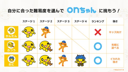 本コラボでは通常の黄色い「onちゃん」や「着ぐるみonちゃん」、「ペットのぐち」「青鬼onちゃん」たちが、森のエクストリームスポーツ「エアホッケー」の対戦相手として登場します。また、本イベントより、難易度が「かんたん」「ふつう」「おに」の三段階用意されており、幅広いユーザーにお遊び頂けるようにしております。その他、イベント用のオンラインランキングも個別に用意されており、ユーザー同士でクリアタイムや得点を競い合えるようになっております。