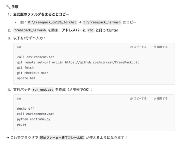 Nirvash版は公式GitHubリポジトリを基に「終了フレーム指定機能」を実験的に追加したもので、GitHubでは「nirvash/FramePack」として公開されている。同リポジトリからコードを入手しセットアップすれば、開始と終了の2枚の画像を指定し、その間を自然につなぐ動画生成が可能になる。