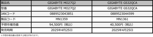 株式会社ニューエックス(本社:東京都千代田区)は、取り扱いメーカーGIGABYTE社よりゲーミング液晶モニターのQD-OLEDモデル「MO27Q2」と1500R曲面パネルのWQHD解像度高リフレッシュレートモデル「GS32QCA」の2製品を2025年4月25日(金)より発売いたします。