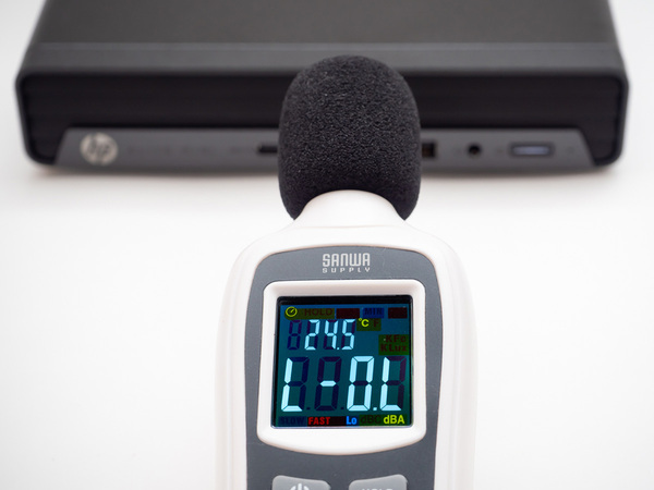 この静かさは、ファンを微調整して静音性と冷却を両立するHP独自の静音化技術「HP Run Quiet」によるところも大きいと思われる。試しに騒音レベルを計測してみたが、プロセッサーに負荷のかかる状況でも騒音計の計測限界値(30dBA)以下を示す表示となった。これなら、机の上に置いた場合でもファンの音がうるさくて仕事に集中できないなんてことは起きないだろう。