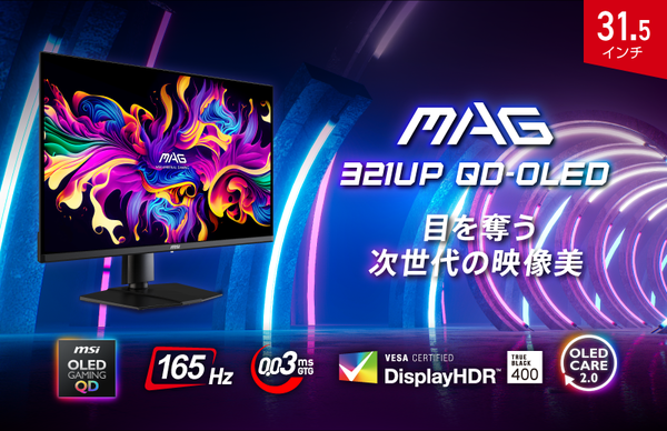 エムエスアイコンピュータージャパンは4月25日より、新型ゲーミングモニター「MAG 321UP QD-OLED」を発売すると発表した。同製品は、31.5インチの4K UHD解像度を持ち、165Hzのリフレッシュレートと0.03ms(GTG)の応答速度を誇る高性能モデルだ。