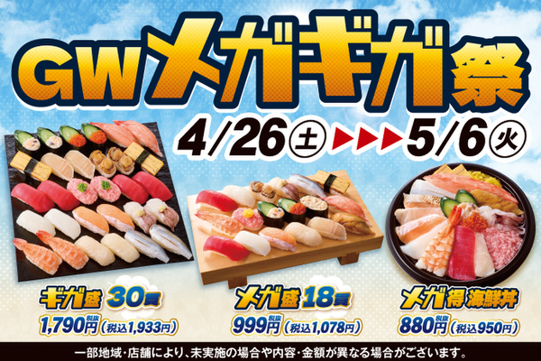小僧寿しは、4月26日~5月6日の期間限定で「ゴールデンウィークメガギガ祭」を開催します。