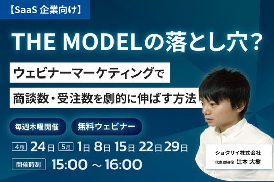 ショクサイ株式会社(代表取締役:辻本 大樹)は4月24日(木)15時よりBtoBマーケティング担当者向けに「【SaaS企業向け】THE MODELの落とし穴?ウェビナーマーケティングで商談数・受注数を劇的に伸ばす方法」を開催いたします。