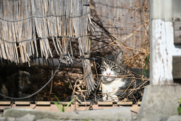 それで撮ったのが冒頭写真。全部で3匹いて、チャトラのハチワレがむくっと起き上がってこっちへ歩いてくるのがわかる。お、もしやなでさせてくれるかと思いきや、2mくらいまでしか近寄ってくれないのだった。