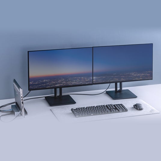 画面を広く使うことができる2画面出力に対応します。USB Type-C接続によるディスプレイ増設「DisplayPort Alternate Mode」に対応しており、ソフトウェアのインストール不要でマルチディスプレイ環境(ミラーモード/拡張モード)を簡単に構築できます。ディスプレイ1台出力時の解像度は最大4K/60Hz(3840×2160)解像度に対応しています。2台接続時はそれぞれ最大4K/30Hz(3840×2160)までサポートします。