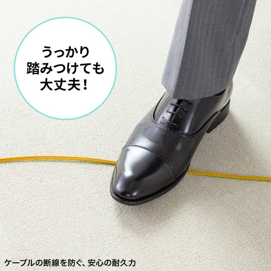 足での踏み付けや、扉の挟み込みなどによる側圧に強い耐久性を持つケーブルです。人の行き来が多い場所での使用も安心です。