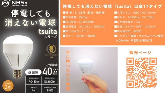 東日印刷株式会社(本社:東京都江東区、社長:西川光昭、以下 TONICHI)は、4月22日、ネット通販サイト「楽天市場T-box」で、停電しても消えない電球「tsuita(ついた)」の口金E17タイプ「coconimo tsuita(ここにも・ついた)」を販売開始しました。天井埋め込み型や間接照明などで近年増えているE17タイプ。お客様のご要望に応えての新発売です。