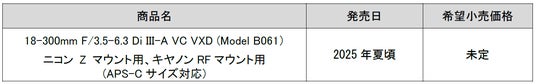 総合光学機器メーカーの株式会社タムロン(代表取締役社長:桜庭省吾、本社:さいたま市)は、APS-Cミラーレス一眼カメラ対応のニコン Z マウント用、キヤノンRFマウント用高倍率ズームレンズ「18-300mm F/3.5-6.3 Di III-A*1 VC VXD (Model B061)」(以下18-300mm F3.5-6.3)の開発を発表します。