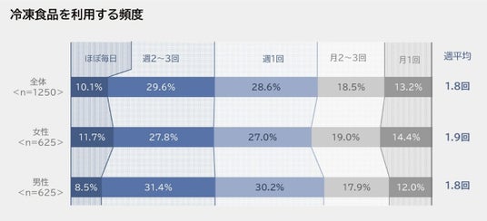 忙しい毎日や昨今物価が高騰している環境において、「タイパ」「コスパ」が注目される中、時短になったり、食材を無駄なく使用できる「冷凍」に対するニーズは年々高まっています。一般社団法人 日本冷凍食品協会の統計によると、2024年の日本人1人当たりの冷凍食品の消費量は23.6 kgで、10年前と比較すると約111%となっています。また、同協会が2025年2月に実施した「冷凍食品の利用状況の実態」に関する調査では、冷凍食品を利用する頻度は男性・女性ともに「週2~3回程度」が最も多く(表1)、冷凍食品の魅力として、「調理の手間が省ける」、「買い置きができる」、「調理時間が短縮できる」、「おいしい」などがあげられました(表2)。