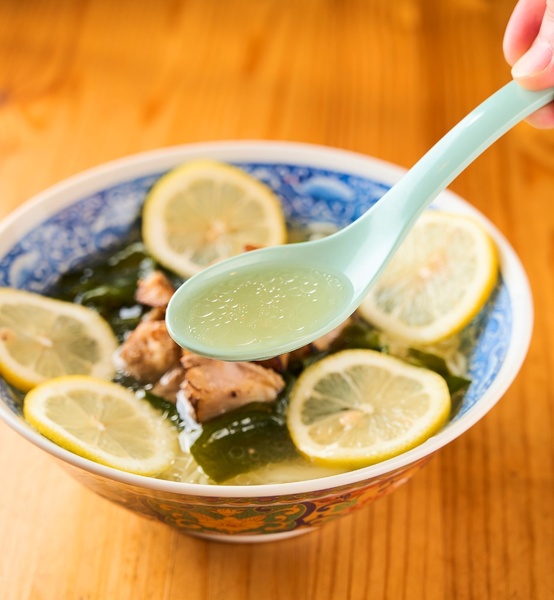 スープは豚の挽き肉、バラ肉をベースにシイタケ、昆布など和風ダシの旨味も詰めたもの。冷製にすることで分離した余分な脂は丁寧に取り除き、よりピュアなあっさりスープへと作り込む。うま味調味料は一切使用せずに天然塩で味付けし、レモンスライスだけでなくレモン油を仕上げ油として採用しているのもポイント。まろやかな塩気、爽やかな酸味があり、グビグビと飲みたくなる“冷っこい”スープが魅力だ。
