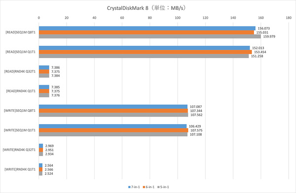 ストレージベンチマーク「CrystalDiskMark 8」で計測した転送速度は、3機種ともシーケンシャルリード(SEQ1M Q8T1)は155~160MB/s前後、シーケンシャルライト(SEQ1M Q8T1)は107MB/s前後だった