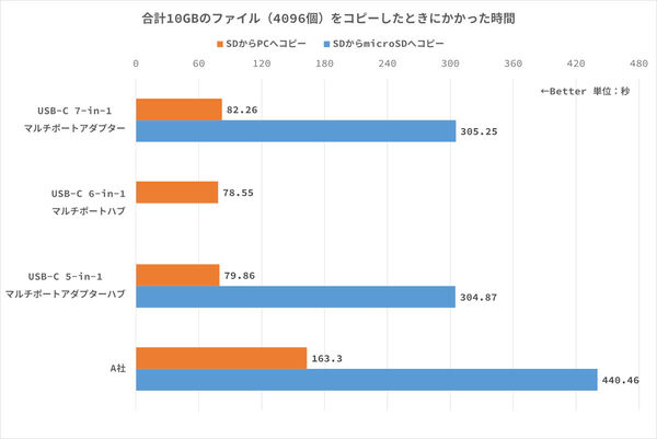 比較のために、SD/microSDカードリーダー(DDR200非対応)を備える他社USBハブ製品でも同じテストを実施したところ、SDメモリーカードからPCへコピーした際の所要時間は約163秒、SDメモリーカードからmicroSDメモリーカードへコピーした際の所要時間は2機種の平均で約440秒となった。SDメモリーカードからPCへコピーにかかった時間は、Belkin製品のほぼ2倍の時間がかかっており、性能差が分かる結果となった。SDメモリーカードからmicroSDメモリーカードへのコピーは、Belkin製品の約1.5倍の時間がかかっている。