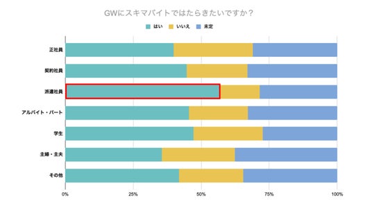 ・雇用形態別では派遣社員が最も多く、57%の方がGW中にスキマバイトではたらきたいと回答した。