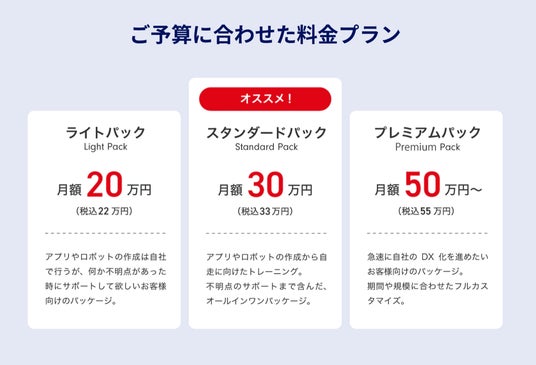 本ソリューションは、IT人材の不足やコスト面の課題から着手が難しかった中堅・中小企業を対象に、業務のデジタル化を支援するサービスです。まずは月額22万円(税込)から、小さな業務課題の自動化を始め、DX化の「成功体験」を積み重ねることで、社内への定着と着実なDX化を実現します。スモールスタートで月々の支出を抑えることで、無理なく確実に業務のDX化を前進させます。本サービスは、2025年末までに5社への提供をすることを目標としています。