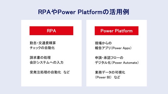 (※2)Power Platform:Power Platformは、Microsoftが提供する「業務効率化ツールのセット」で、ノーコード・ローコードでアプリや自動化を作れるのが特徴です。主に「ワークフローの自動化」「業務アプリの作成」「データの可視化・分析」「チャットボット作成」といった4つのツールがあります。特にPower Automateは、RPAと似た役割を果たし、ExcelやTeams、Outlookなどと連携してMicrosoft 365環境での業務を自動化することが可能です。