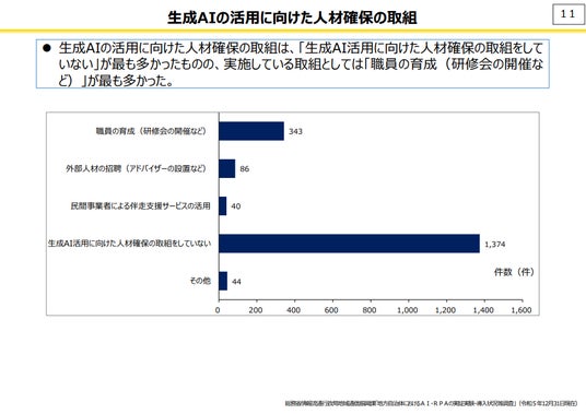 また、総務省の報告によると、生成AIの活用に向けた人材確保の取組は、「生成AI活用に向けた人材確保の取組をしていない」が最も多かったものの、実施している取組としては「職員の育成(研修会の開催など)」が最も多かったことが明らかになっています。しかし、研修の実施状況にはバラつきがあり、適切な教育が提供されていない自治体では、生成AIの活用が進まない傾向にあります。