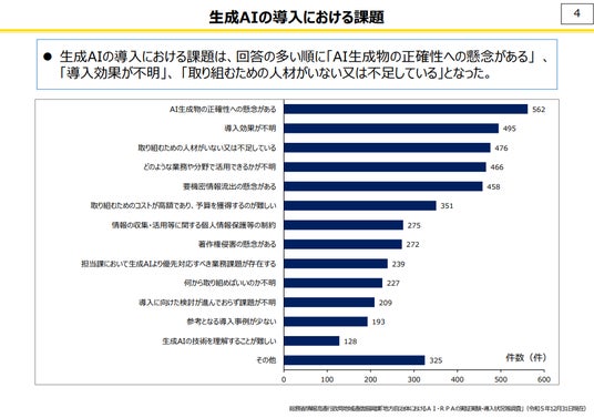 しかし、自治体が生成AIを導入・活用するうえで、以下のような課題が指摘されています。