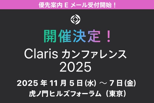 2025 年 4 月 23 日 - ローコード開発プラットフォームを提供する Claris International Inc.(本社:米国 カリフォルニア州)は、2025 年 11 月 5 日(水)~ 7 日(金)の 3 日間、虎ノ門ヒルズフォーラム(東京都港区)にて、Claris 最大の年次カンファレンス「Claris カンファレンス 2025」を開催することを発表しました。Claris カンファレンスでは、AI 活用をはじめとしたローコード開発テクニック、ユーザ登壇の DX 成功事例、参加型ワークショップなど 60 以上のセッションがすべて無料で提供されます。