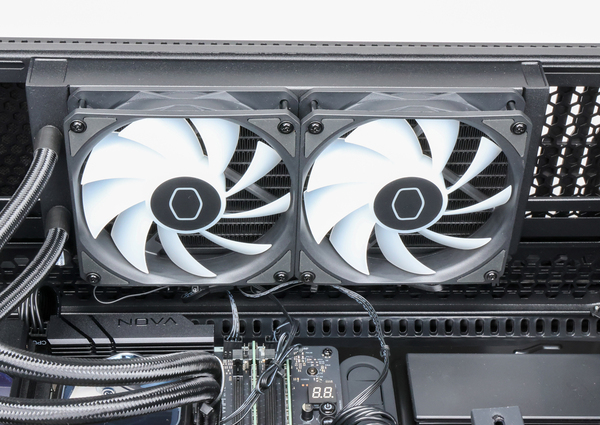そのRyzen 9 9950X3Dの冷却に、ZEFT R61SBAではCoolerMasterの簡易水冷クーラー「MasterLiquid 240 Core II Black」を採用。製品名どおり、240mmサイズのラジエーターが組み合わされたモデルで、ZEFT R61SBAではトップパネルにラジエーターが装着されている。