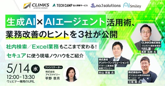 【5/14開催ウェビナー】生成AI×AIエージェント活用術、業務改善のヒントを3社が公開 ~社内検索/Excel業務もここまで変わる!セキュアに使う現場ノウハウをご紹介~