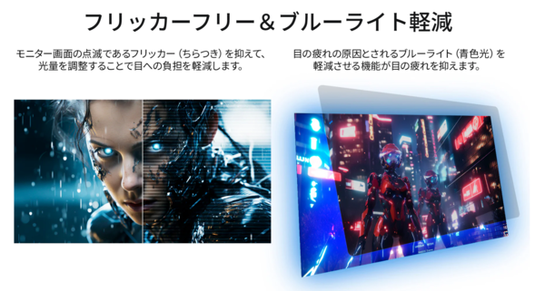 機能としては、「AMD FreeSync」に対応しており、オンにすると画面のティアリングやスタッタリングを低減してくれます。また、ディスプレー画面の点滅となるフリッカー(ちらつき)を抑えるフリッカーフリーや、目の疲れの原因とされるブルーライトを軽減する機能も搭載。さらには、RTS、FPS、GAMEといったPicture Modeもあるので、好みに合わせた色合いに調整して使うことも可能です。