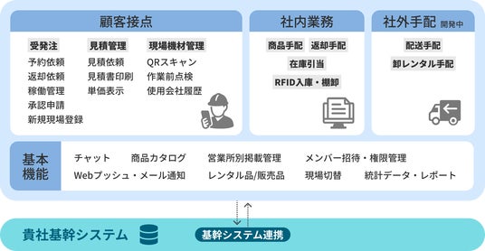 - 主要業務を網羅 - 商品カタログ、受発注、見積管理、稼働管理、作業前点検、チャット、社内手配、在庫引当、RFID入庫・棚卸まで建機レンタルの主要業務をカバー