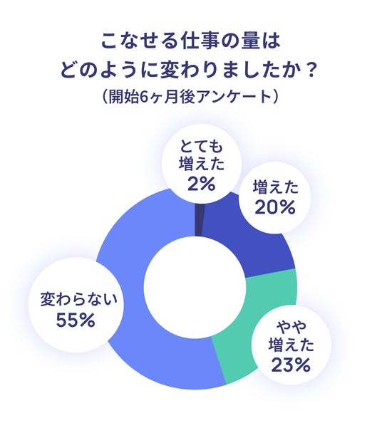 「週休2日の時と比べ、自分自身がこなせる仕事の量はどのように変わったと感じますか?」という質問に対しては、「減った」は0%、「増えた」は約45%(とても増えた2%、増えた20%、やや増えた23%)、「変わらない」も55%