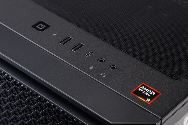 ケース天板の前面側にはUSB Type-A 3.0×2、Type-C×1を搭載。Type-Cポートは最大でUSB 3.2 Gen 2x2に対応できる。「AMD Ryzen プロセッサ」搭載を示すロゴシールがうれしい