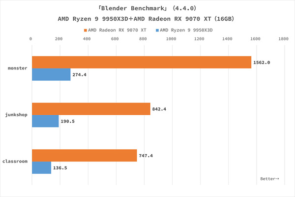 最初に試したベンチマークソフトは「Blender Benchmark」だ。「Blender」(Version 4.4.0)を用い、「monster」「junkshop」「classroom」の3種類でレンダリング性能を計測している。また「AMD Ryzen 9 9950X3D」だけで計測した場合と、「AMD Radeon RX 9070 XT」で計測した場合(Open CL)の両方を実施した。この結果であれば、「AMD Ryzen 9 9950X3D プロセッサ」「AMD Radeon RX 9070 XT」がクリエイティブ用途でも高いパフォーマンスを期待できるといえるだろう。