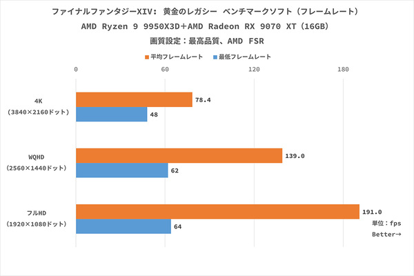 ここでは、4K(3840×2160ドット)解像度、またレイトレーシングを「オン(高)」に設定した状態でも、平均フレームレートが100fpsを超えている点に注目したい。まさに、「AMD Ryzen 9 9950X3D プロセッサ」「AMD Radeon RX 9070 XT」の実力が分かるという結果だ。こちらも、実際のプレイでは「AFMF 2.1」によってさらに高いフレームレートで遊べるだろう。