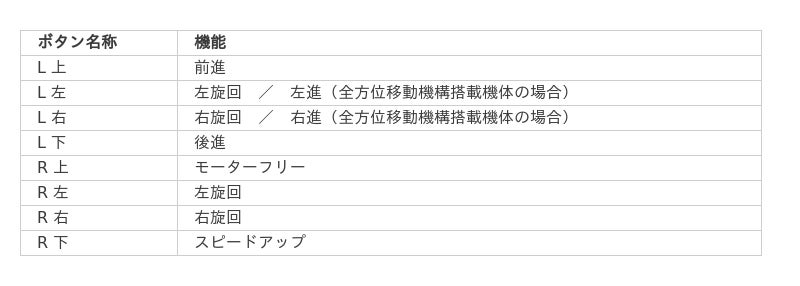 本オプションにおいては、以下に示す機能を各ボタンに割り当てています。それぞれのボタンへ割り当てる機能については、台車ロボット本体のファーウェアを変更することにより、自由にカスタマイズが可能です。用途・目的に合わせた最適化ができるため、研究開発用台車ロボットの可用性がいっそう高まります。