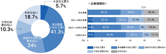 セキュリティ対策が十分であるかという質問に関しては、「十分だと思う」と回答したのは5.7%のみで、ほとんどの企業がセキュリティ対策に不安を抱いていることがわかりました。とくに50人~200人未満の中小企業で「十分ではない」と明確に感じている割合が高く、十分な対策を取るリソースが不足している可能性があります。