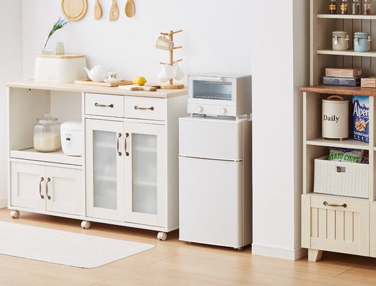天板は耐熱温度100℃・耐荷重30kgの高耐久設計で、電子レンジや電気ケトル等の設置も可能です。