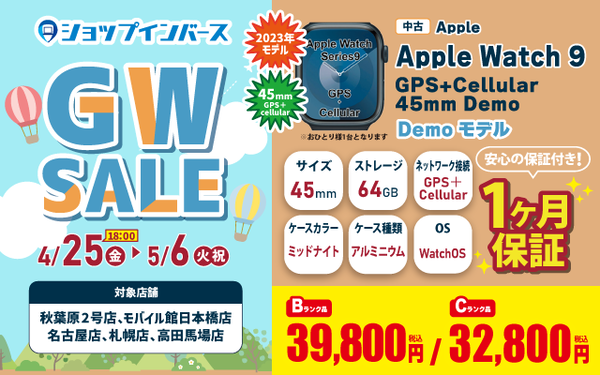 ・Apple Watch 9 GPS+Cellular 45mm Demo ショップインバース秋葉原2号店、日本橋モバイル館、名古屋店、札幌店、高田馬場店