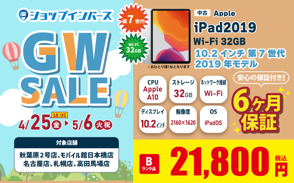 ・iPad2019 Wi-Fi 32GB ショップインバース秋葉原2号店、日本橋モバイル館、名古屋店、札幌店、高田馬場店