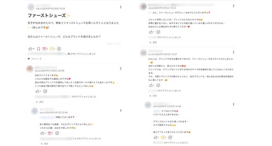阪急うめだ本店に来店いただいている方を中心としたコミュニティで、共通の話題や目的をもつ方が集う環境のため、一般的なSNSと比べて心理的安全性が高いことから、「どこで買えるの?」「この商品の使い方は?」といった疑問や悩みを気軽に共有できる場になっています。同じ悩みを抱えるママ同士だからこそ、本音で話せるコミュニティとなり、より深いコミュニケーションが生まれています。