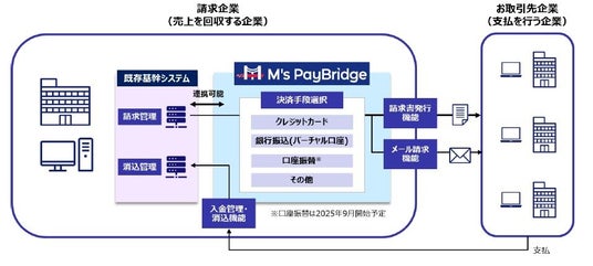 このため、両社は、2024年10月に締結した業務提携契約(※1)に基づき、みずほ銀行が持つ金融領域における知見やサービス・顧客基盤と、GMOイプシロンが持つ決済代行業務における知見やノウハウ、GMOイプシロンの加盟店に提供済みのオンライン決済インフラである「fincode byGMO」を活用し、多様な業務効率化サービスと決済サービスをシームレスに結びつける企業間決済プラットフォーム「M's PayBridge」を構築・提供することにしました。