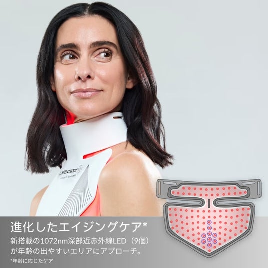 特に胸元エリアのカバー力が向上し、より深い位置までしっかりアプローチ。さらに、胸元部分にはより肌の深部まで届く近赤外線LEDを9個搭載しており、年齢サインが気になりやすいデコルテの集中ケアも可能です。