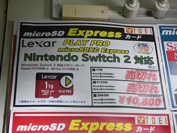 Nintendo Switch 2に対応するレキサー製microSD Expressカード「Lexar PLAY PRO microSDXC Express Card」の256GBモデルがテクノハウス東映に入荷。1万800円で販売されている。