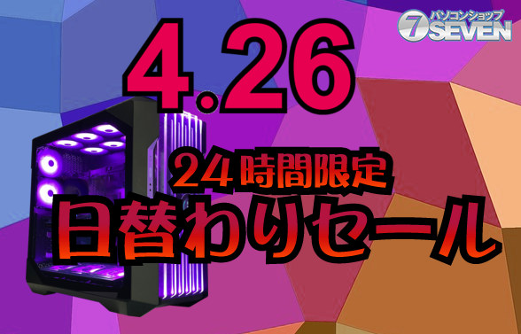 セブンアールジャパンは、4月26日限定で最新のゲーミングPCやデスクトップPCを最大50,000円オフで提供する特別セールを開催する。セールは4月26日の0:00から23:59までの24時間限定で行われる。